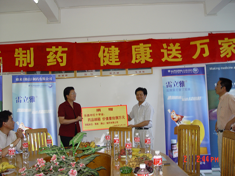 2005年,佛山手心制藥為支持黨中央提出在全國開展山區建設、共建和諧社會的活動,向韶關樂昌市捐助接近20萬元藥品,包括雷立雅、頭孢拉定膠囊、麻仁軟膠囊等家庭常用藥。